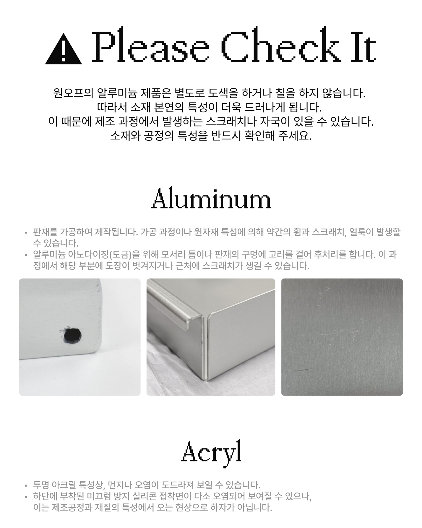 - 모니터 상의 색상이나 질감 차이, 원자재 및 제조 공정상 발생할 수 밖에 없는 부분의 경우, 교환 및 반품이 불가합니다.